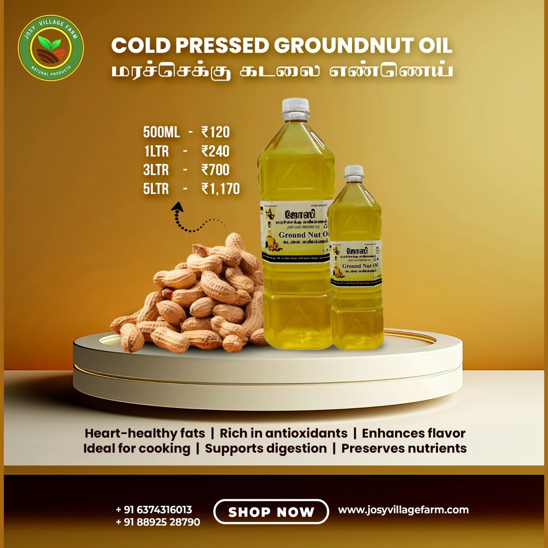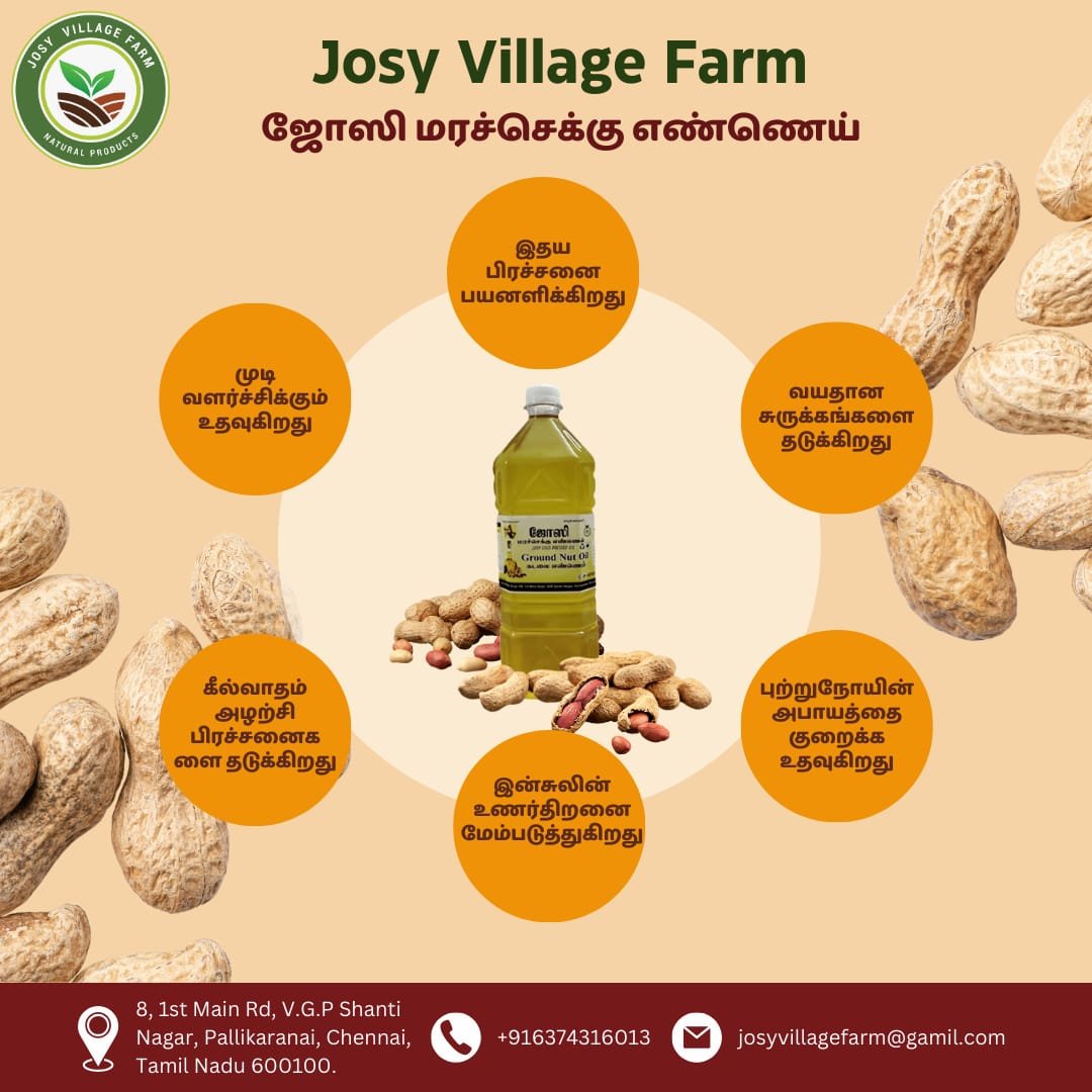 Experience the essence of traditional oil-making techniques at Josy Village Farm, established in 2021. Explore an extensive selection of pure Marachekku cold Pressed oil/wood pressed groundnut oil, gingelly oil, and coconut oil. Now offering cow ghee, natural sweets, salts, millets, traditional rices, health snacks, herbal medicines, and cosmetics. Free home delivery in and around Pallikaranai makes it convenient for customers to enjoy authentic flavors and holistic wellness. Discover the difference with Josy Marachekku Oil, where quality remains uncompromised while sourcing directly from farmers allows for competitive prices. Taste the tradition and embrace a healthier lifestyle with Josy Village Farm.